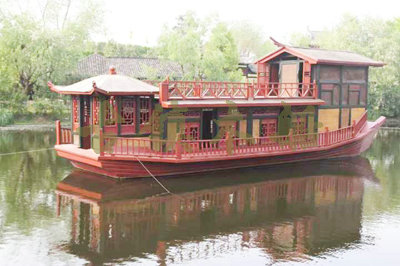畫舫船就是裝飾古典華麗的游船,是"中國風"的仿古游船,結合古典園林建筑,體現了中華文明的古典藝術.畫舫船豪華而又古典,船上的建筑按照中國古代建筑里的亭臺樓閣,建筑工藝之復雜,要求之嚴格,仿古畫舫游船的特點飛檐翹角、玲瓏精致的四角亭子逐漸成形,赫然立于船頭,美人靠、盤龍柱子、彩畫……龍柱上的浮雕盤龍和祥云一層扣著一層,層層錯落有致,雕刻精細到盤龍身上的每一個鱗片都細細可數,古代皇家標志性元素,在畫舫船上體現的淋漓盡致。除了雕刻、花窗,整條船還有一個看點,那就是弧線優美、高高翹起的船尾。游船并不大,長約10米、寬3米,但是整體看起來堪稱一件藝術品。船尾的雕花欄桿與船艙、船頭的雕刻遙相呼應,船身四周貼著浮雕祥云,給整條船增添了富貴、華麗的氣質。